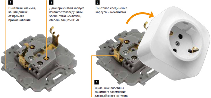 - Усиленные латунные пластины обеспечивают надежный контакт в цепи защитного заземления при многократных коммутациях.
