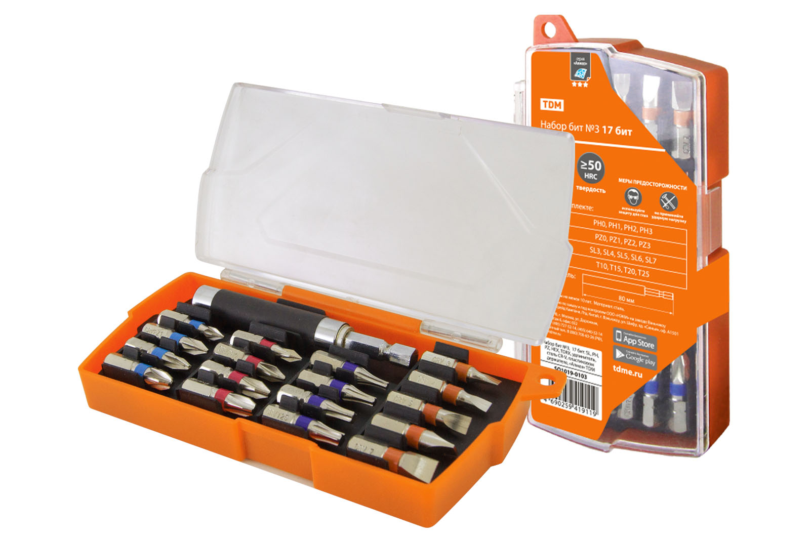 Материалы:Для набора 2 сталь марки S2. Для остальных наборов хром-ванадиевая сталь CR-V. Преимущества:Оптимальный подбор бит в наборе, как для домашнего, так и для профессионального использования. Количество бит в наборе в зависимости от артикула 6, 10, 17 и 66 штук.Удобное хранение.Назначение:Для монтажа различного типа шлицевых, торцевых, специальных элементов крепежа.Использование в качестве оснастки для дрелей-шуруповёртов. Упаковка:Индивидуальный пластиковый держатель, содержащий всю не