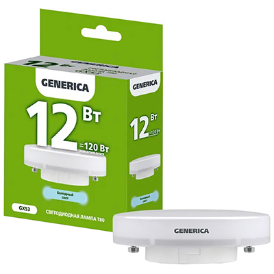 Лампа светодиодная Generica LL-T80-12-230-65-GX53-G (tablet, 220 В, 12 Вт, 1200 лм, 6500 К)