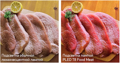 - Специально подобранный спектр излучения розового цвета подчеркивает и усиливает естественные цвета мяса и мясных продуктов.