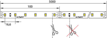 - Ленту можно резать только в обозначенных местах, между контактными площадками для пайки.