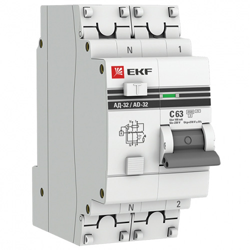 Выключатель автоматический дифференциального тока АД-32 1P+N 63А / 100мА (характеристика C, тип AC, электронный, защита 270 В) 4,5кА EKF PROxima