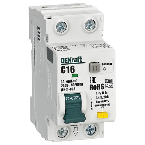 Автоматический выключатель дифференциального тока DEKraft ДИФ103-6кА-1N-16А-30-АС-C (1Р+N, 16 А, характеристика C, 30 мА, 6 кА, тип АС)