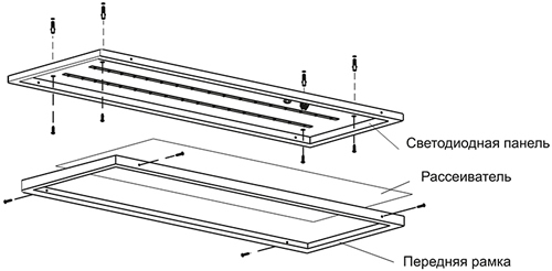 - В обратном порядке установить на панель рассеиватель и переднюю рамку.