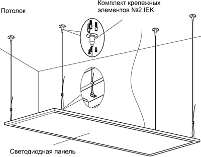 - Подвесной монтаж светодиодной панели осуществляется с помощью комплекта крепёжных элементов № 2 IEK.